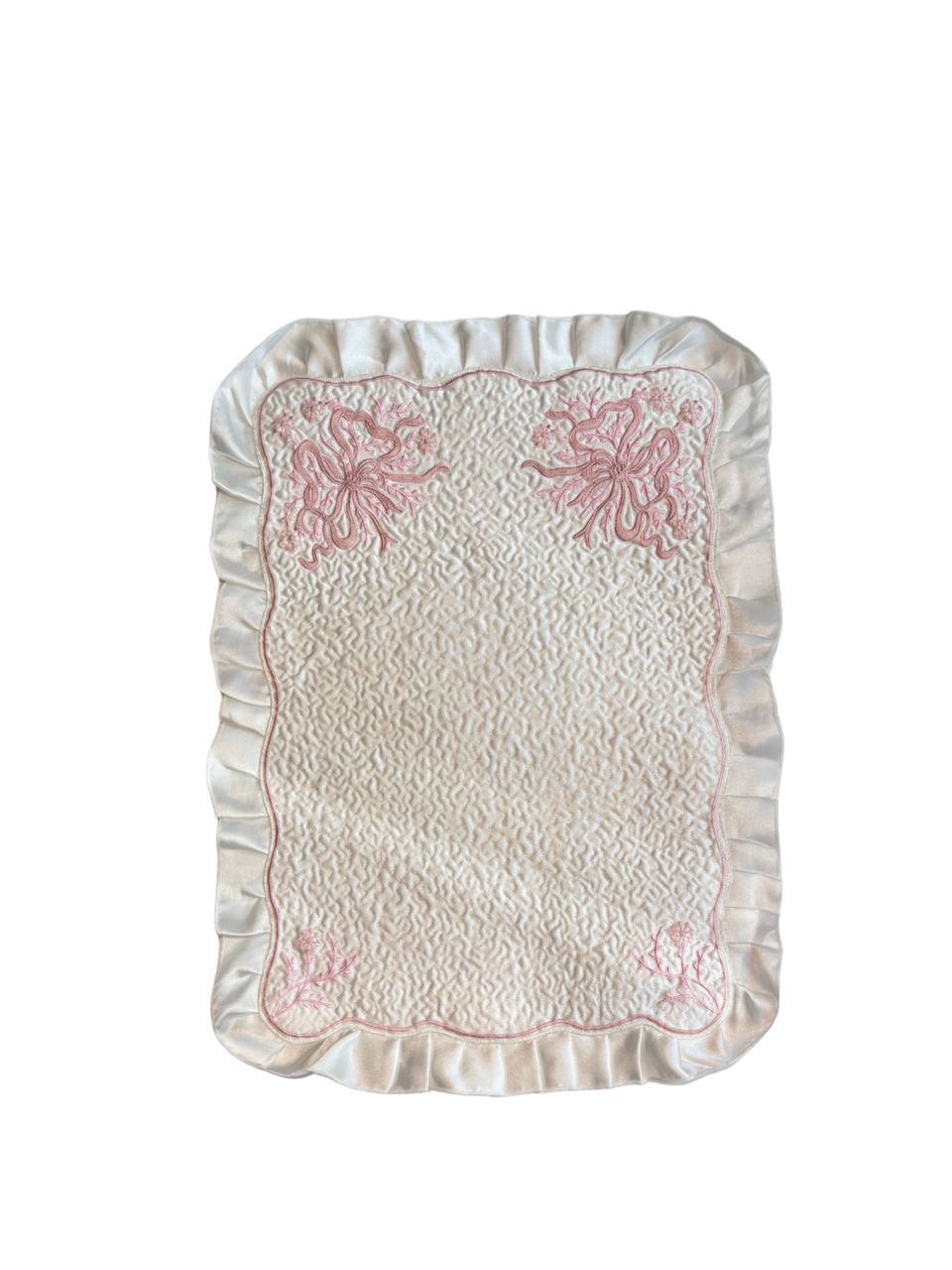 Alas Sujud Sulam Layali is created from premium satin fabric with a soft sheen. Decorated with delicate ribbon embroidery and floral details at the corners and the edges are finished with ruffled satin for a exclusive touch. Soft, lightweight, and travel friendly which perfect for daily use or as a thoughtful gift.