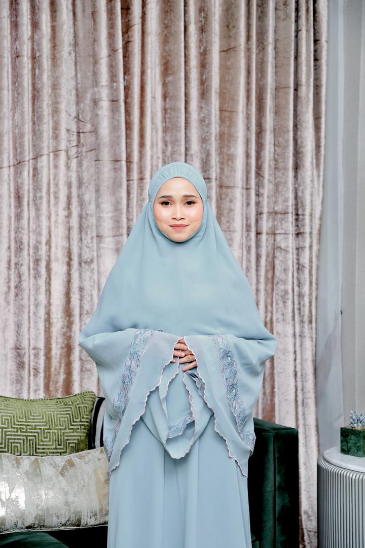 This complete set comes with a mini telekung and a matching jubah, crafted from soft, flowy fabric that feels cool and comfortable on the skin.