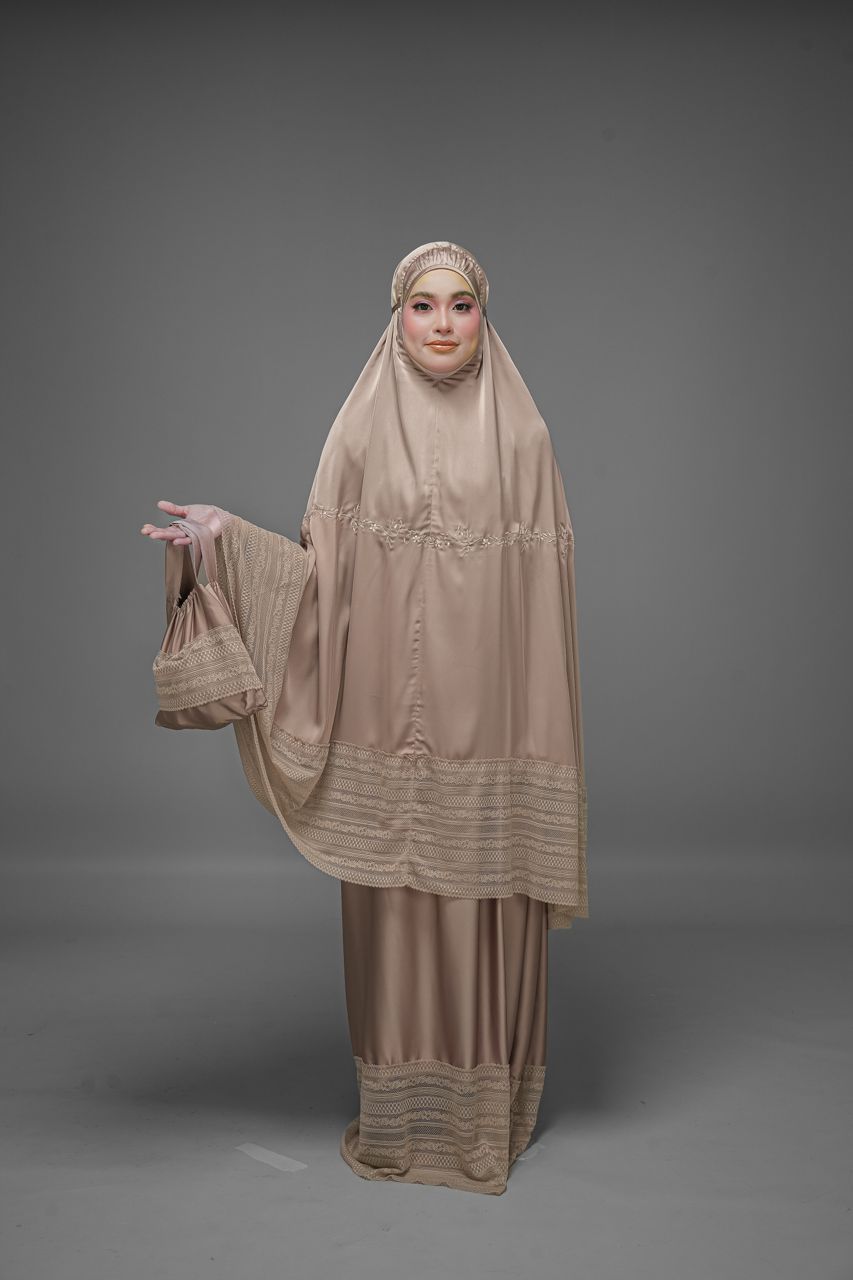 Crafted from luxurious Armani Silk, Telekung Al-Amaya offers a soft, cool and beautifully flowing feel, designed to bring comfort and serenity in every prayer. Its lightweight texture makes it effortless to wear and gentle on the skin, perfect for both daily use and travel.